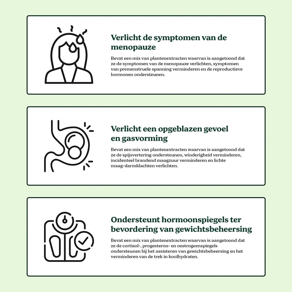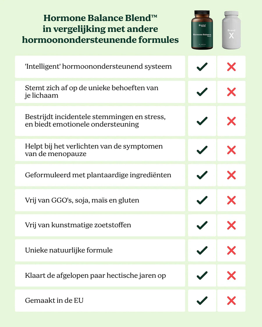 Hormone Balance Blend™ is een unieke, synergetische formule die de onderliggende oorzaken van hormonale onbalans aanpakt met behulp van een geavanceerde driestapsaanpak: het herstel van de darmgezondheid, het bevorderen van de ontgifting van de lever en het reguleren van de stressrespons. Het combineert wetenschappelijk gevalideerde plantaardige ingrediënten, zoals prebiotica-rijke maca-wortel, adaptogene ashwagandha en hormoonregulerende kuisboombes, met detox-ondersteunende ingrediënten zoals rozemarijn- en salie-extracten. Elk bestanddeel is zorgvuldig geselecteerd vanwege de klinisch bewezen voordelen en draagt bij aan het geleidelijk herstellen van de oestrogeen-, progesteron- en cortisolspiegels. Deze uitzonderlijke formule is verder verrijkt met essentiële cofactoren zoals zink en B-vitamines om de hormoonhuishouding te optimaliseren. Gefabriceerd volgens de hoogste zuiverheidsnormen, het is veganistisch, vrij van synthetische toevoegingen en gebaseerd op zowel traditionele geneeswijzen als moderne wetenschap - het biedt holistische ondersteuning voor stemming, energie, slaap en een regelmatige ongesteldheidscyclus.